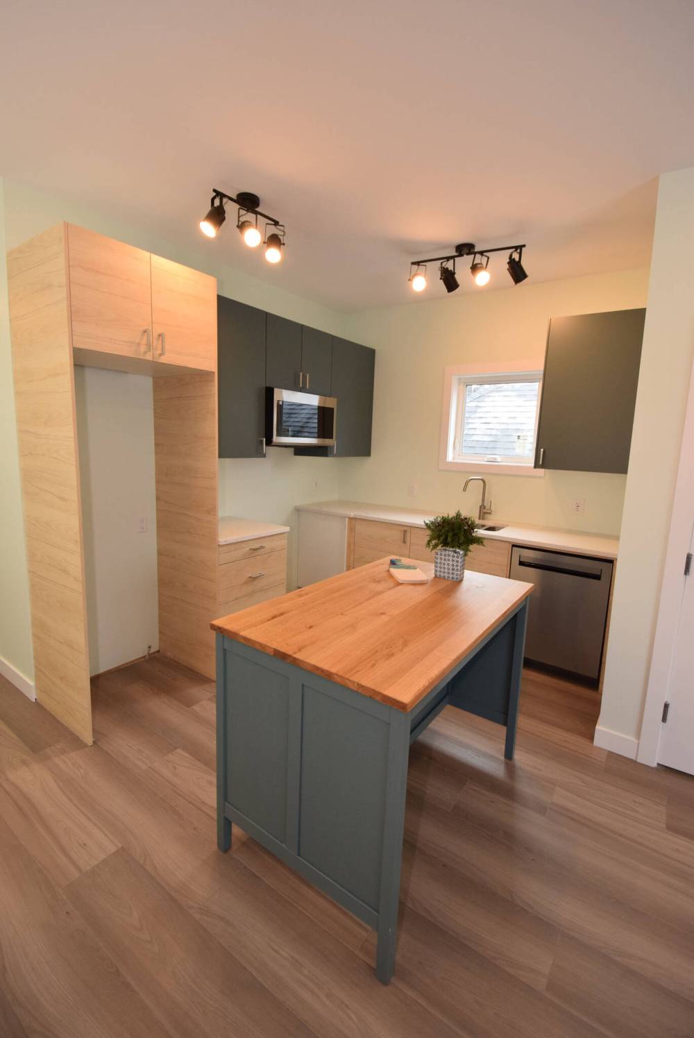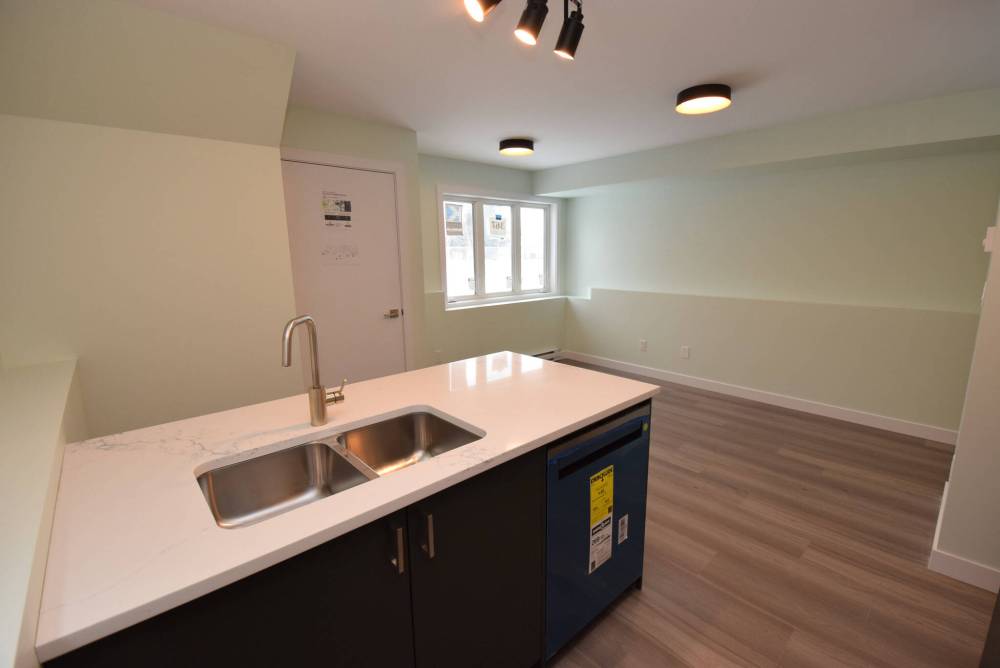 “Take the kitchen. It comes with a movable island that seats three, plus two-tone, soft-close cabinets, quartz countertops and track lighting above. All the lights — including pot lights over the living room — are energy-efficient LED lights,” MacAngus says.