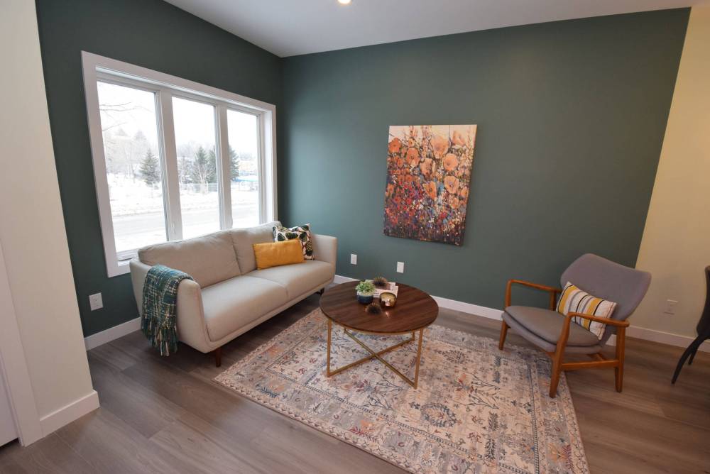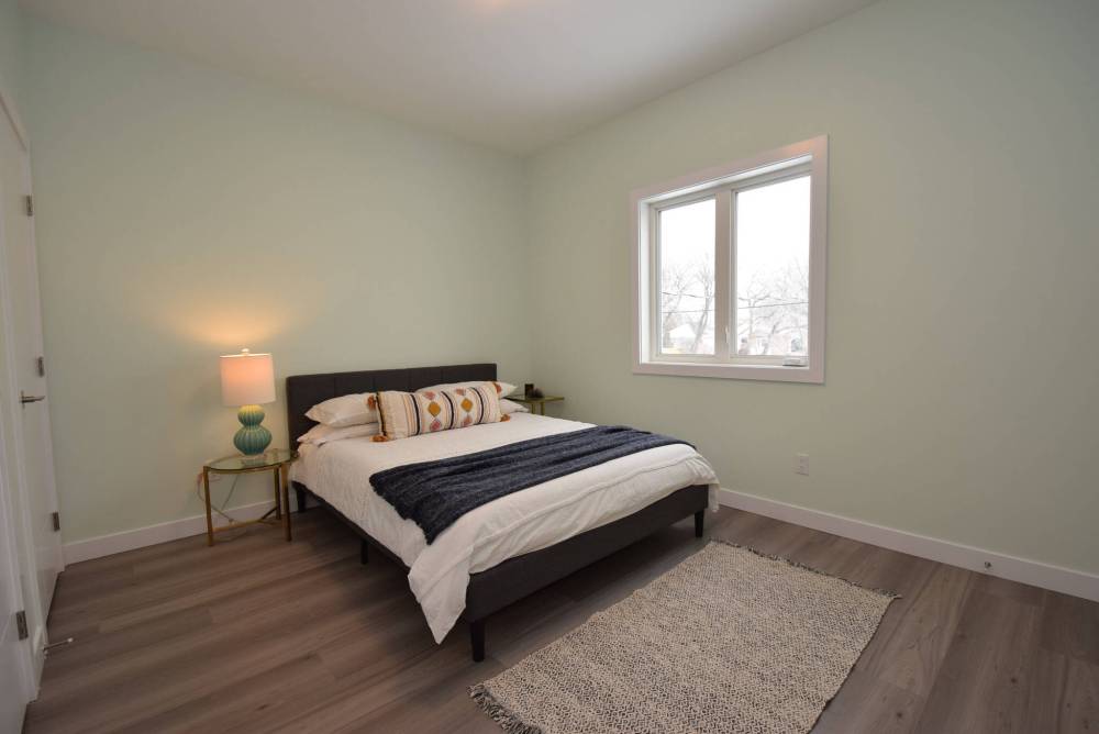 A hallway to the rear of the kitchen then leads to a four-piece bath, two bedrooms and a common space featuring a laundry area and all the home’s mechanical systems.