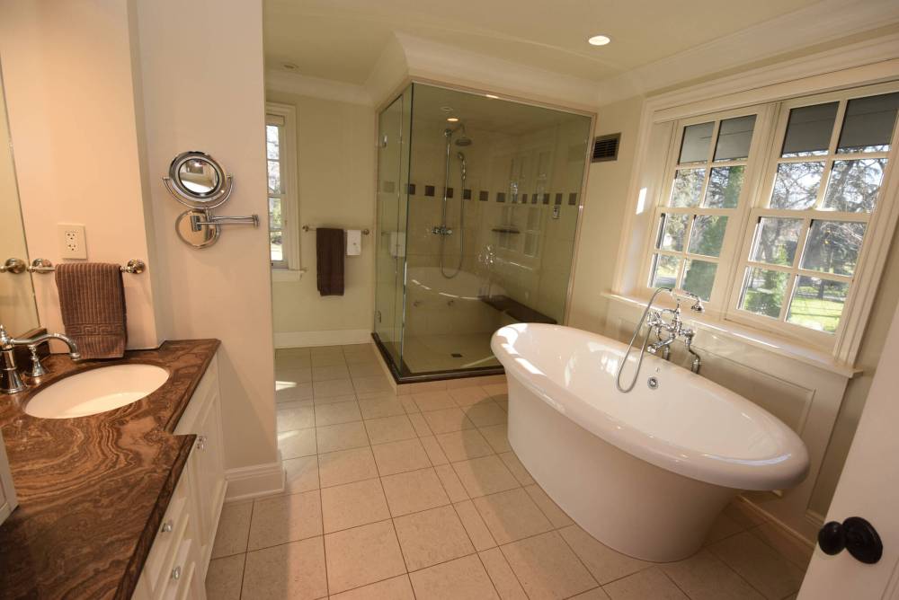 The lavish, spa-inspired ensuite is anchored by a freestanding soaker tub and custom glass/tile walk-in shower.