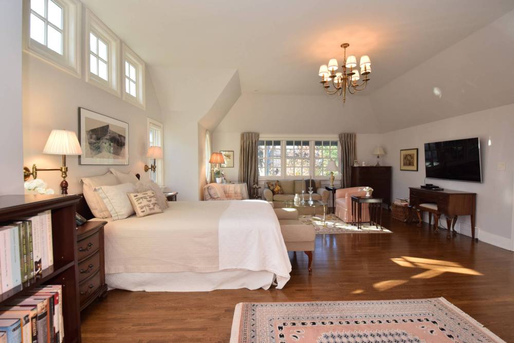 A thoroughly captivating space, it checks in at an impressive 19-by-17 feet complete with a vaulted ceiling, wealth of windows, sitting/media area and gleaming oak hardwoods.