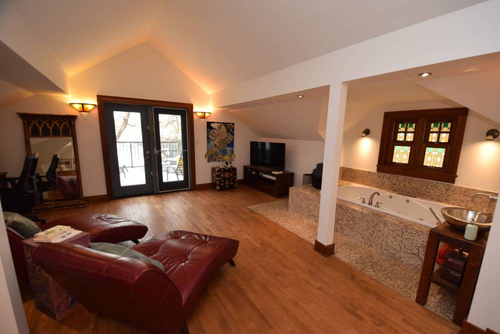“It’s basically a combination bedroom/great room,” Moore says, noting the bedroom checks in at an impressive 750 sq. ft. “There’s a separate bedroom area which opens onto an open-concept area. It starts off with a huge, jetted soaker tub set in a Tyndall stone surround next to a huge oak-trimmed window.”