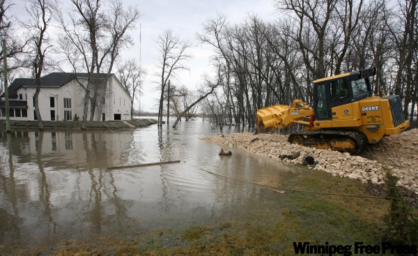 Heavy equipment began pushing tonnes of crushed rock to shore up a ring dike around 140 Turnbull Drive, which was being eroded by the fast-flowing Red River just a few hundred metres north of the floodway gates and bridge.
