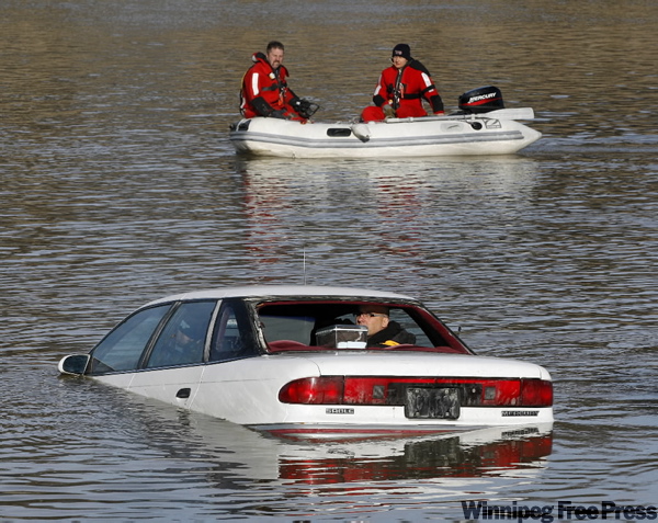 University of Manitoba’s Dr. Gordon Giesbrecht submerged himself in a car in the Red River at St. Vital Park to raise awareness after the recent death of Brandon softball player Ashley Neufeld, who drowned with two friends when their Jeep plunged into a pond in North Dakota.