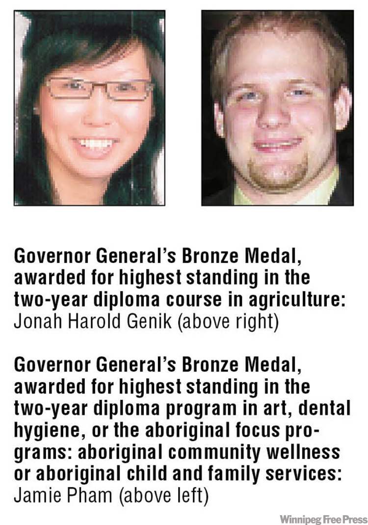 Governor General’s Bronze Medal, awarded for highest standing in the two year Diploma program in Art, Dental Hygiene, or the Aboriginal Focus Programs: Aboriginal Community Wellness or Aboriginal Child and Family Services — Jamie Pham