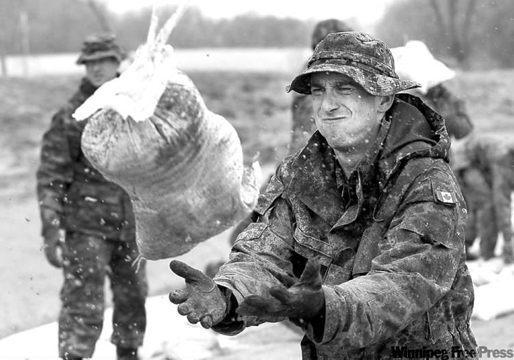 Bombardier Dave Sopko of CFB Shilo does sandbag duty Tuesday on Hwy. 26 near PR 248.