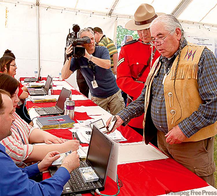 The event is the opening ceremony of the Urban Treaty Payments, celebrated Tuesday at The Forks National Historic Site, one of dozens of events where $5 bills will be paid out, one by one, to as many of the 130,000 treaty Indians in Manitoba who line up to collect them this summer. Some 8,000 will attend the ceremonies at The Forks this month.