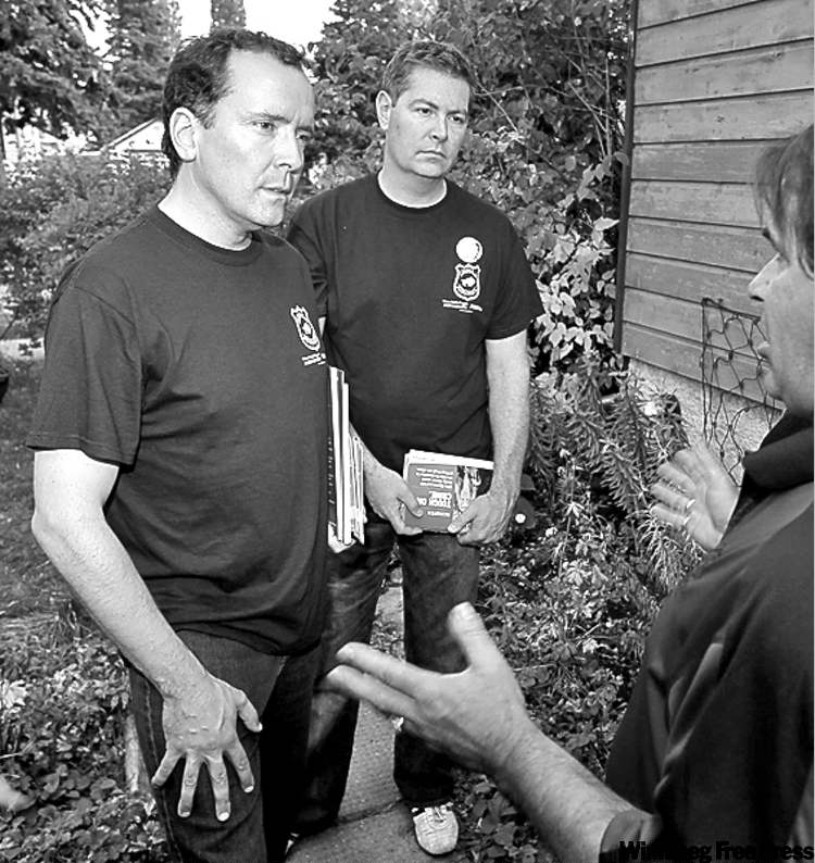 Winnipeg Free Press Boris Minkevich / Winnipeg Free Press Hugh McFadyen (left) and St. Vital PC candidate Mike Brown work the streets in St. Vital.