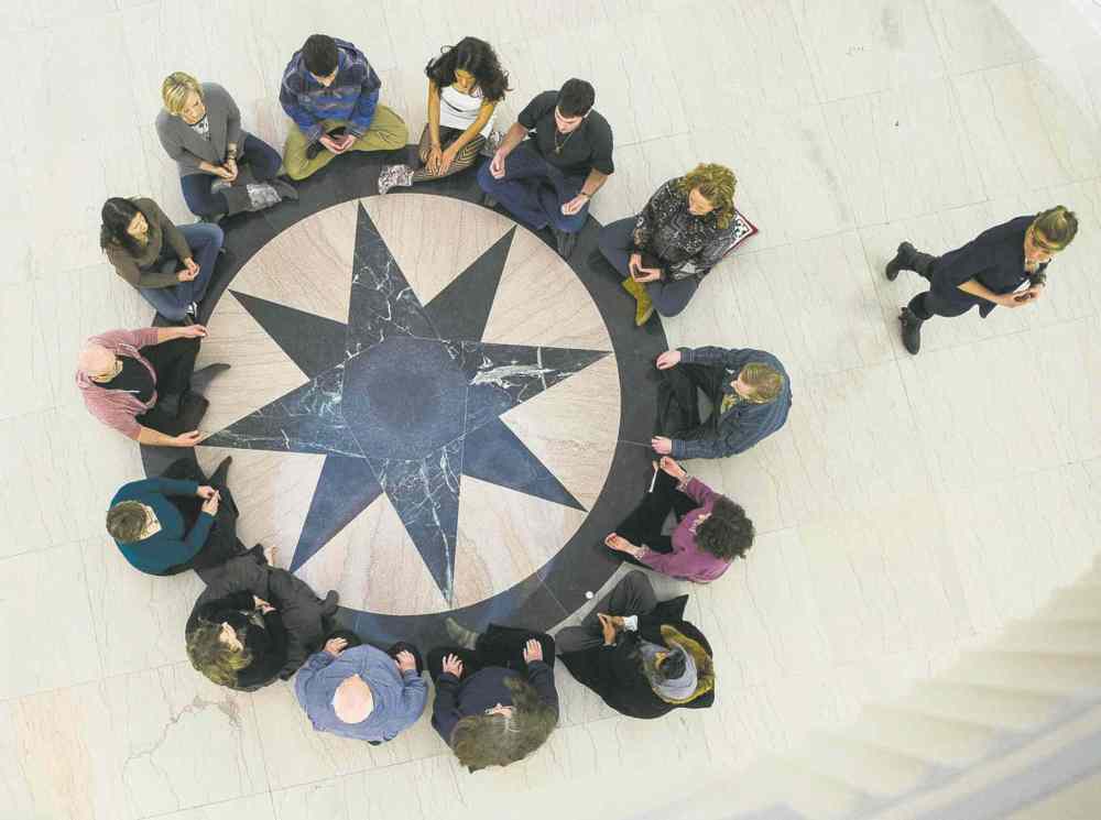 Fourteen men and women circled the edge of the black star, sitting in meditative positions with their eyes closed.