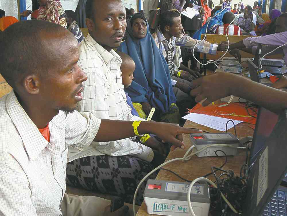 The registration process is in a series of sheltered areas, starting with vaccinating children, security checks and biometric and fingerprint scans. Their identity records are entered into Kenyan government and UNHCR databases.