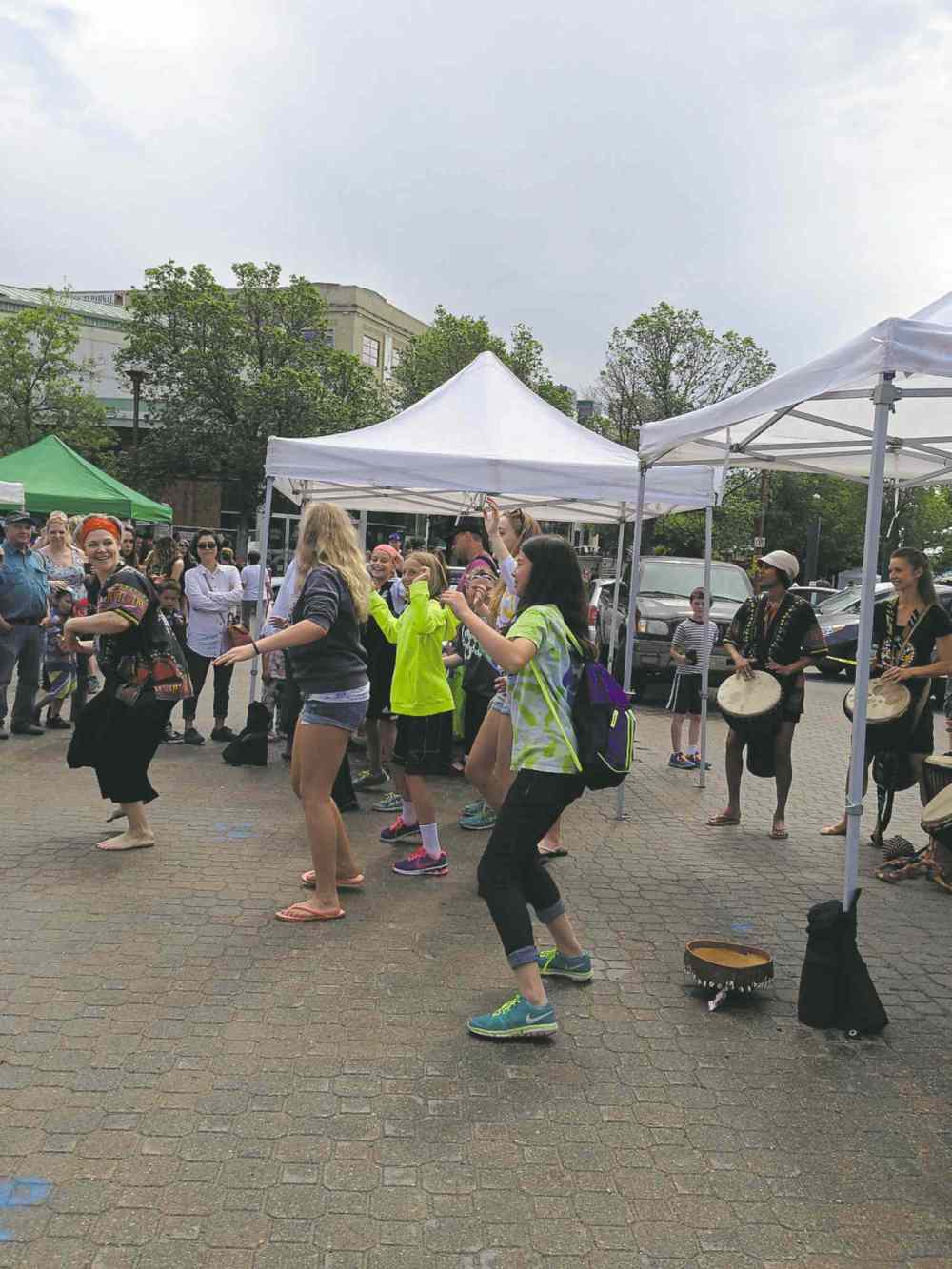 Malachi, with his two-month-old sister, Quinn, looking on from a nearby stroller, was moved by the music and the mesmerizing drum beats of the Drum Café group performing at the 2015 grand opening of the farmers market.