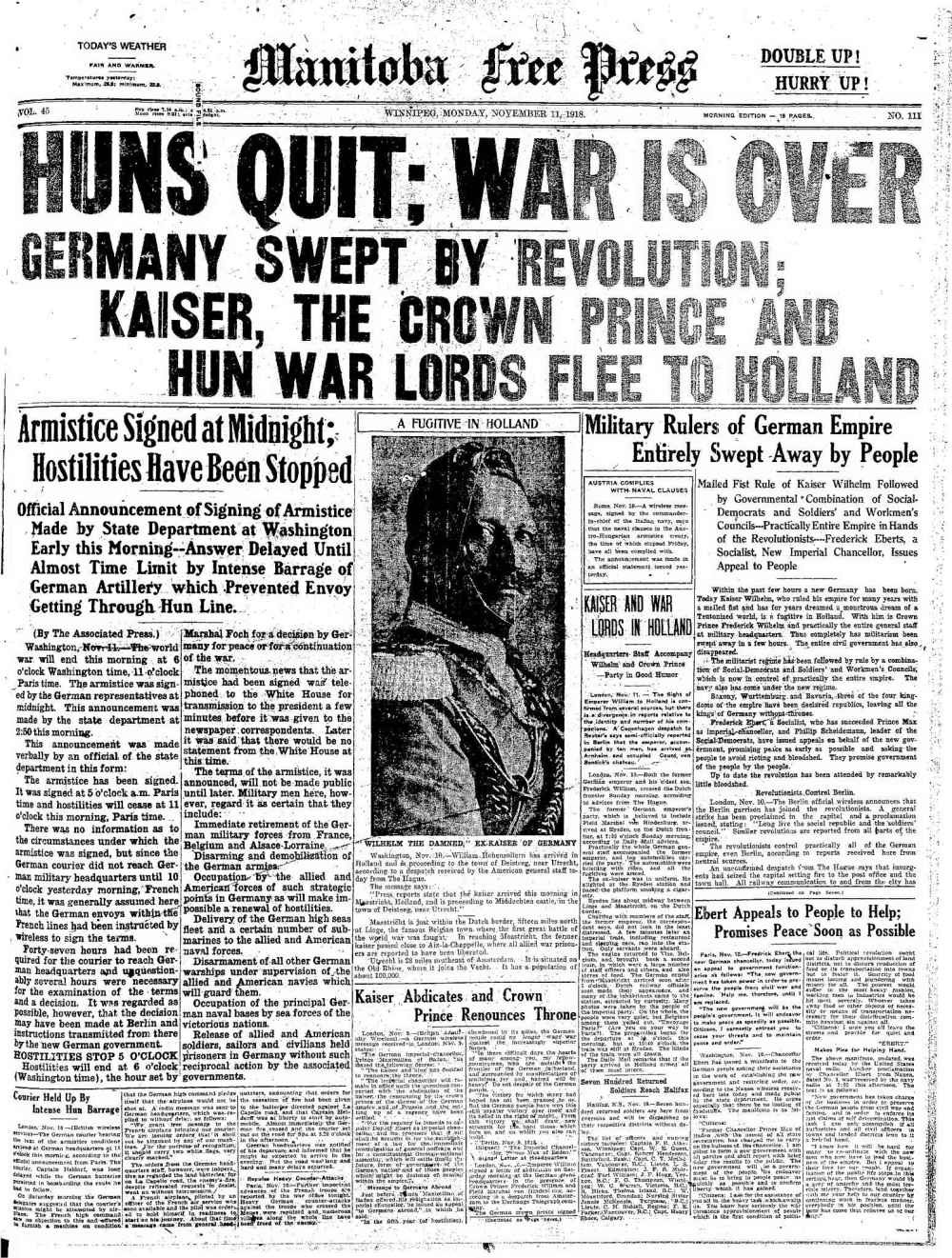 At about 2 a.m. on Monday, Nov. 11, Winnipeggers were awakened when all the steam whistles the CPR could muster began to blow. The railroad had just been told by the Winnipeg Telegram newspaper that the war would be over at 11 a.m. that morning. Newsboys ran into the streets with extras confirming the news. By 4 a.m., the downtown streets were as crowded as they had been on that long ago day in August 1914 when the Great War began. Everybody just wanted to make noise and they did with car horns and pot lids and anything else they could lay their hands on.