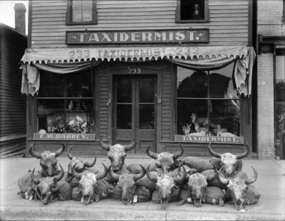 The Victorian British notion of “decorating” homes with “stuffed animals” had its heyday among sportsmen and the well-to-do of Canadian society, too. However, by around 1890, the notion was butting heads with the nascent conservation movement. Yet, the federal and provincial governments needed immigrants to settle and tame Canada’s vast, rich, untrammelled West. Stuffed, mounted wildlife was considered symbolic of the North West Territory’s “superabundance,” and thus integral to strategies for attracting immigrants to Canada. Taxidermy displays were featured at provincial, national and international exhibitions, and taxidermists were kept busy supplying mounts. By about 1902, George Atkinson, Alex Calder, Edward Darbey, George Grieve, Abel Hine and his three sons, and William White were noted Winnipeg taxidermists, all with shops on Main Street. Winnipeggers eagerly attended these shops and exhibitions because, until 1932, the city had no permanent public museum to exhibit natural history specimens.