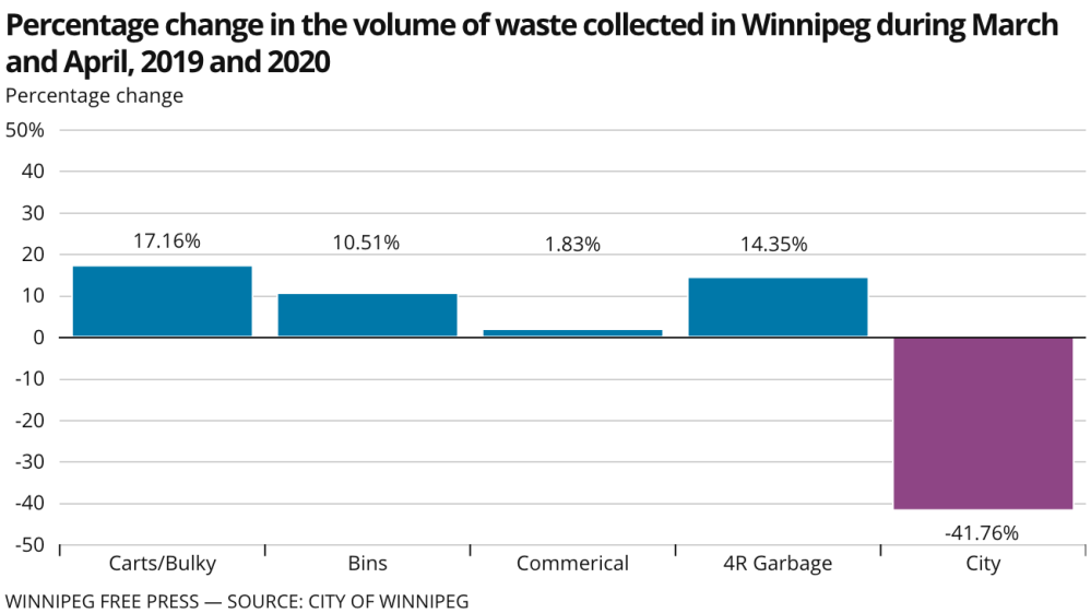 However, the only thing that has made up for some of the increased residential waste is a decrease in waste collected from City of Winnipeg facilities. With many such facilities closed, this has dropped substantially.