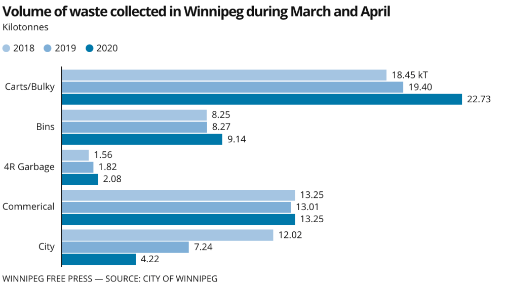 According to City of Winnipeg statistics, the amount of collected household waste has also risen substantially over the course of the novel coronavirus pandemic, mainly driven by pickup from single-family residences.