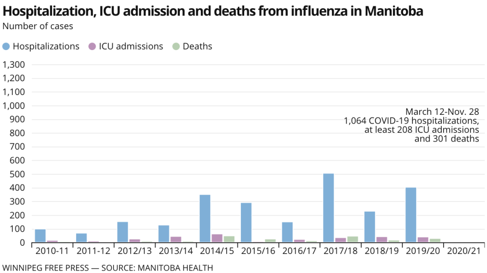 From March 12, when Manitoba recorded its first case of COVID-19, to Nov. 28, 1,064 people have been hospitalized with the disease — more than double the number of flu patients in hospital in 2017-18.