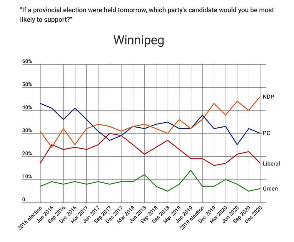 In Winnipeg, the Tories trail the NDP by a remarkable 16 points.
