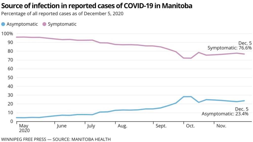 Twenty-three per cent of all COVID-19 cases in Manitoba are asymptomatic, although testing has been skewed towards symptomatic patients for the majority of the pandemic.