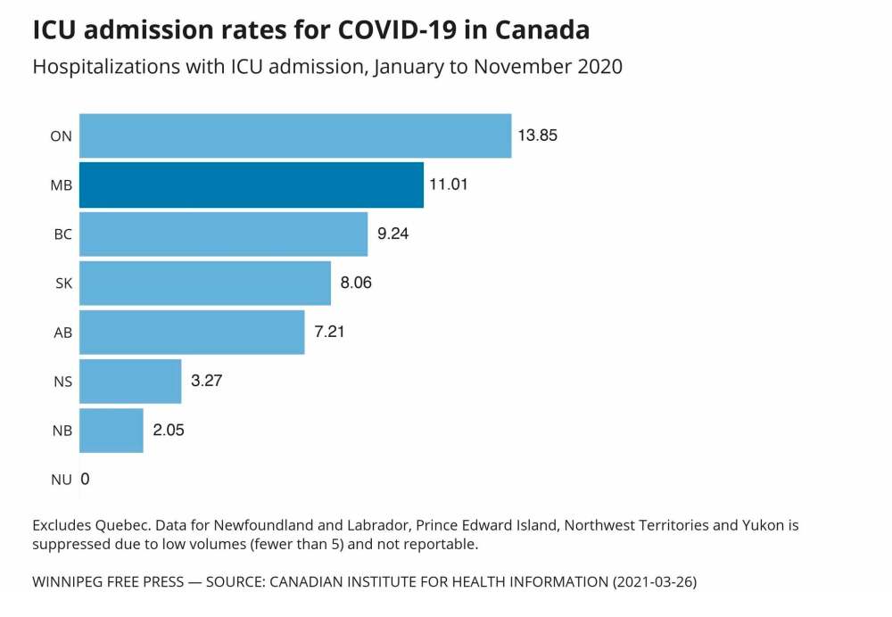Manitoba’s per capita rate of COVID-19 ICU hospitalizations was one of the highest in the country (second to Ontario) between November 2020 and January 2021, according to data released this week by the Canadian Institute for Health Information.