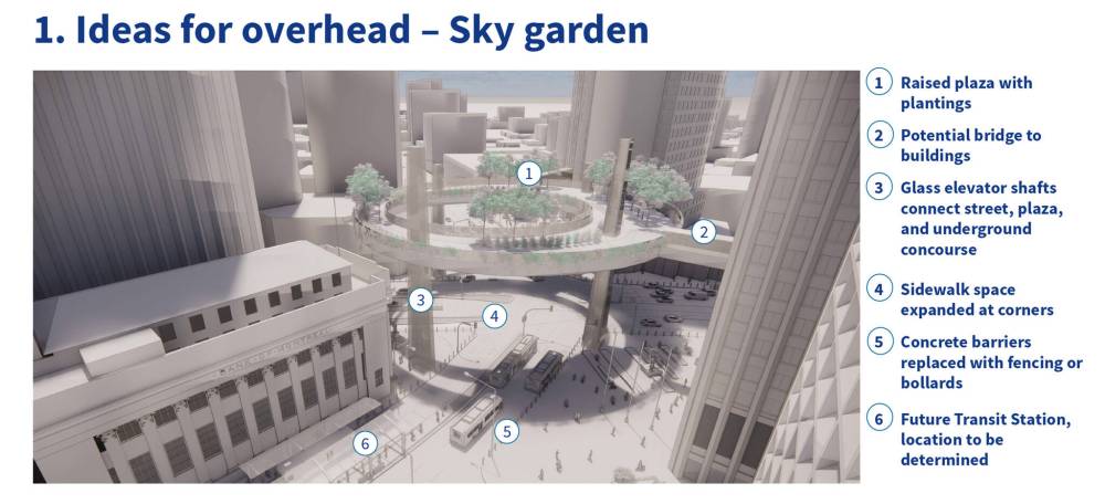 There were designs that leaned heavily on improved streetscaping with lights and public art, and removable barriers to allow access to the intersection for special events. Other more ambitious designs featured observation towers or a park-like deck built over the intersection.
