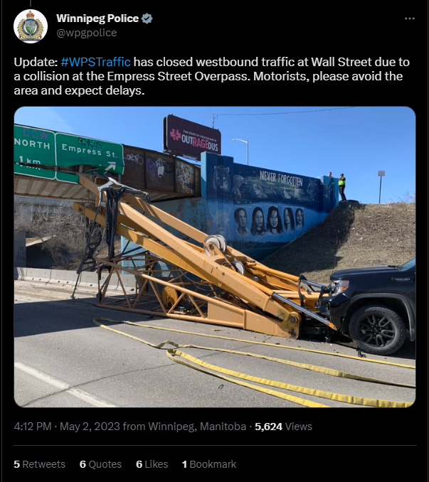 The Winnipeg Police Service posted photos from the scene, showing a large, yellow piece of equipment trapped between the bridge and the westbound roadway.