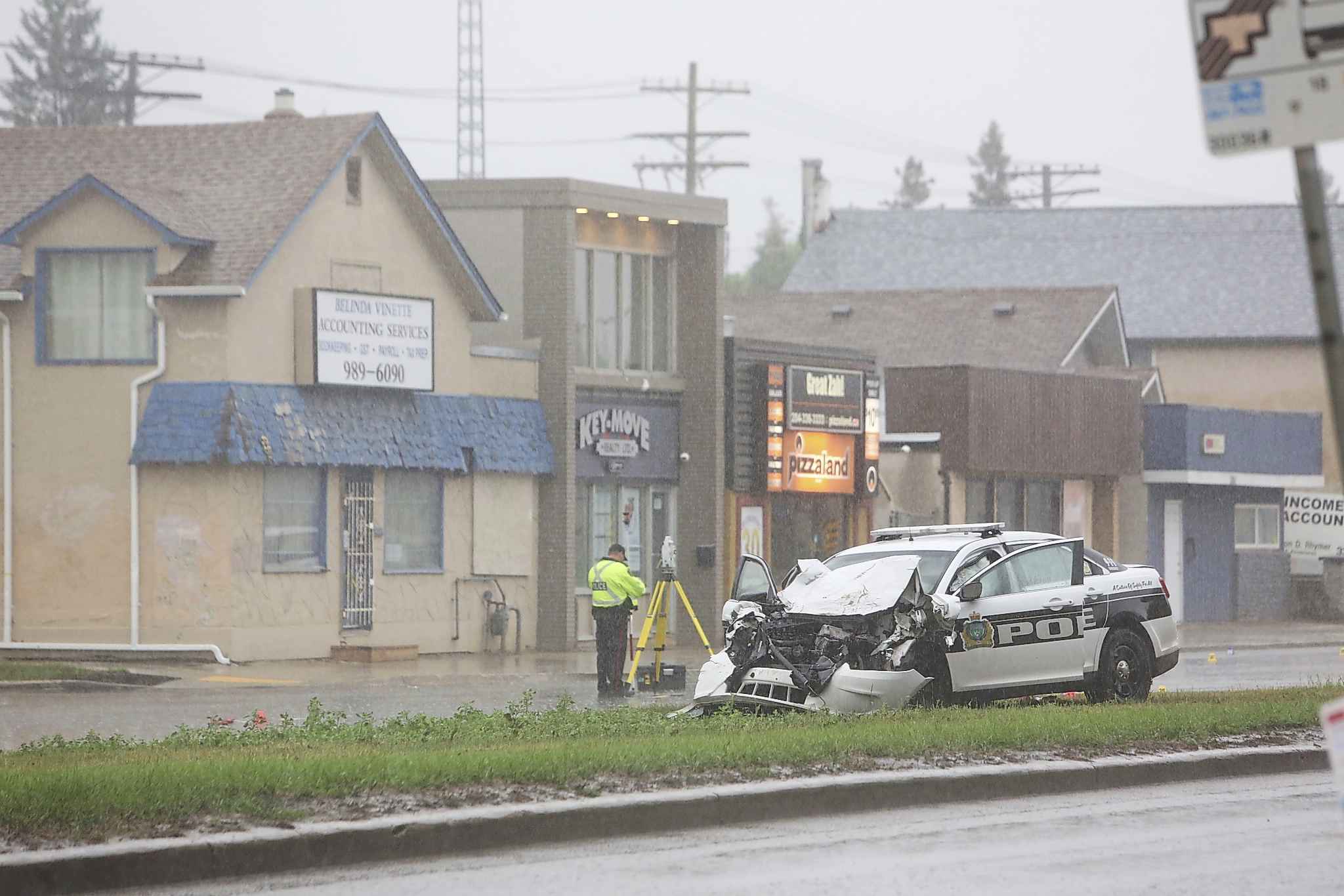 Winnipeg Police Service investigators at the scene of a major vehicle collision involving a police car, a pickup truck and possibly a white panel van at Main Street and Belmont Avenue.