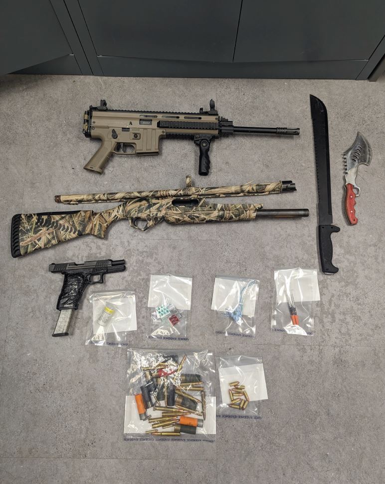 RCMP arrested four people and found a loaded handgun, two other firearms, a machete, ammunition and unspecified drugs.