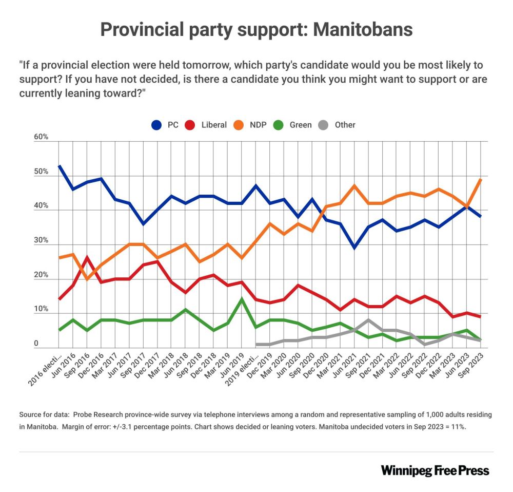 More important, the NDP has a commanding lead in Winnipeg (the main battleground of Manitoba elections) with 57 per cent support, more than double the PC party’s 28 per cent.