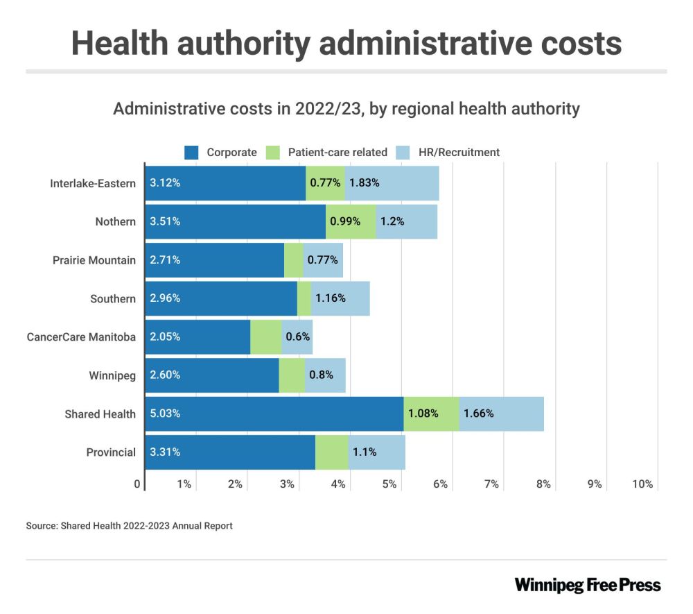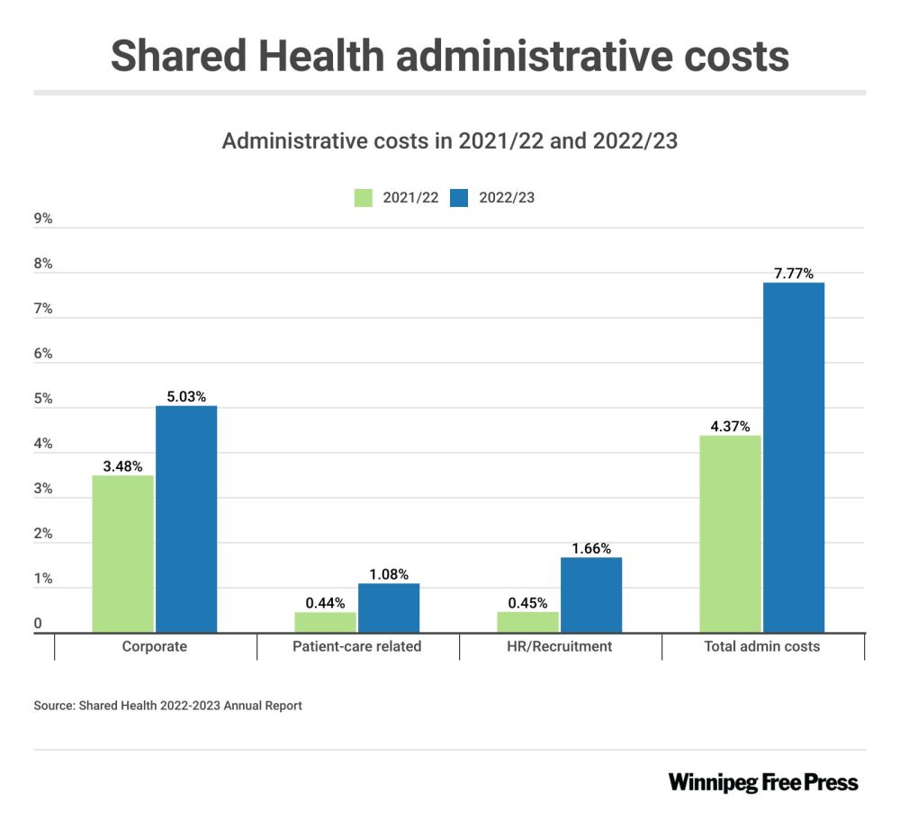 Administrative costs made up 7.77 per cent of Shared Health’s total spending last year, a significant jump from 4.37 per cent the previous year.