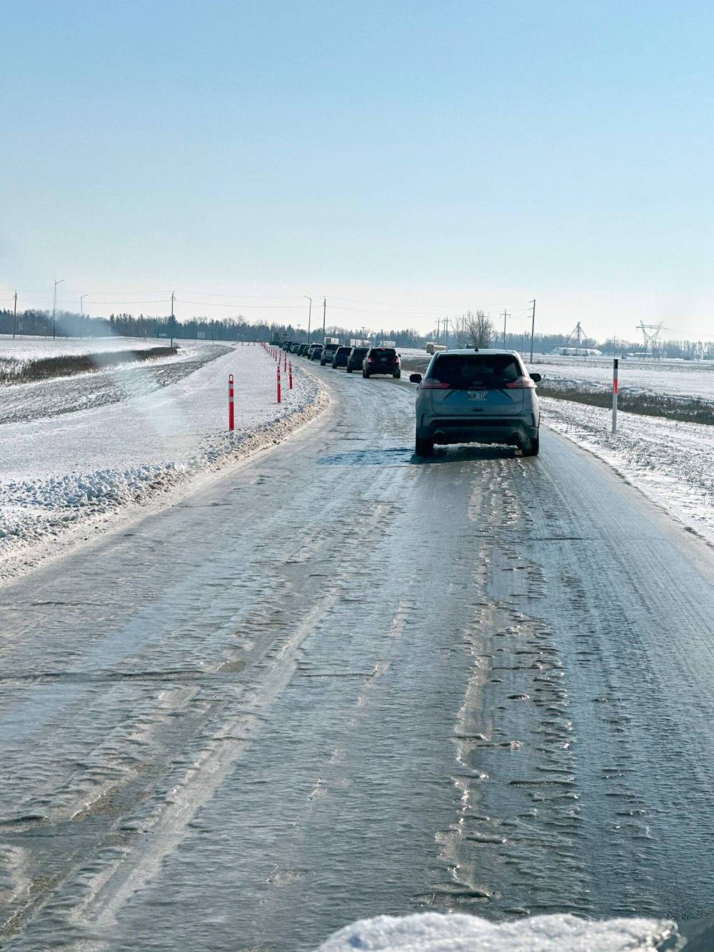 Supplied Vehicles travel along Highway 75’s ice-covered southbound lanes at St. Jean Baptiste, shortly before the highway was closed in both directions between Morris and the Canada-U.S. border early Saturday afternoon. The lanes reopened Sunday morning.
