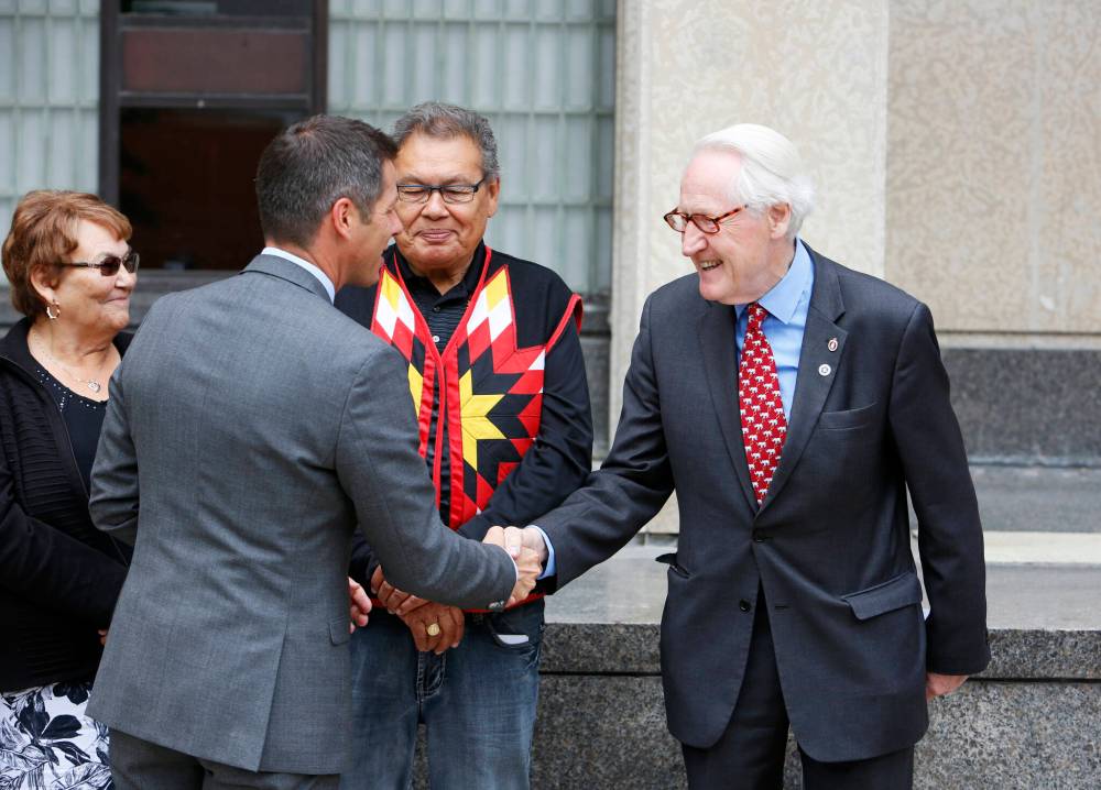 Former mayor Brian Bowman and James Alexander Douglas-Hamilton, Lord Selkirk of Douglas shake hands in front of City Hall in 2017 during a tree planting ceremony to mark the Bicentenary of the Peguis Selkirk Treaty.