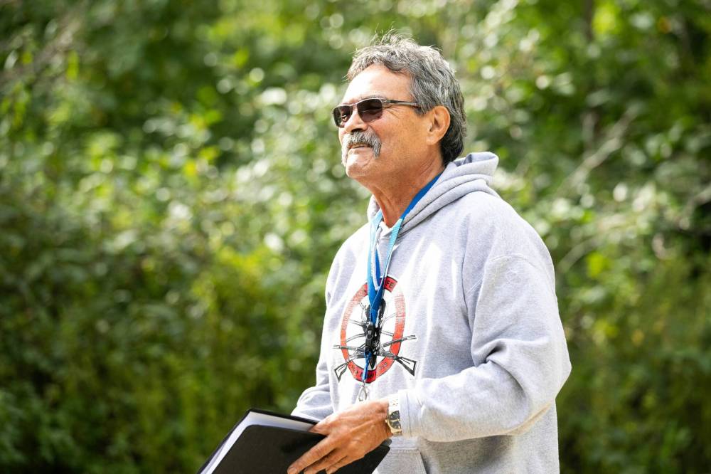 Métis elder Henry Hall, a knowledge keeper in the Lord Selkirk School Division, welcomed the crowd during Thursday's grand reopening of a field trip site near Albert Beach.