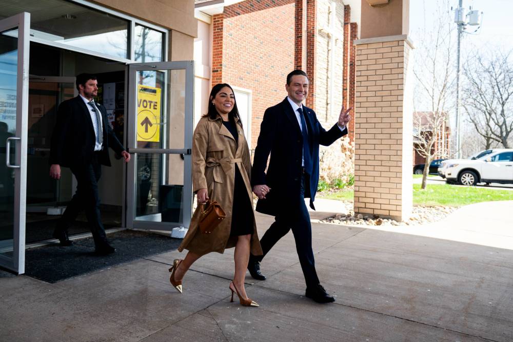 Conservative Party Leader Pierre Poilievre, right, and his wife Anaida Poilievre depart a polling station after voting in Ottawa on Monday.