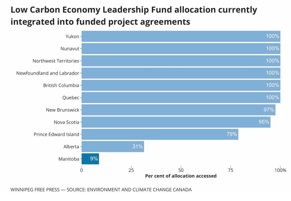 Information obtained by the Free Press under freedom of information legislation showed, as of January, Manitoba has only accessed $5,862,999 of an available $66,754,000 from Ottawa’s low-carbon economy leadership fund.
