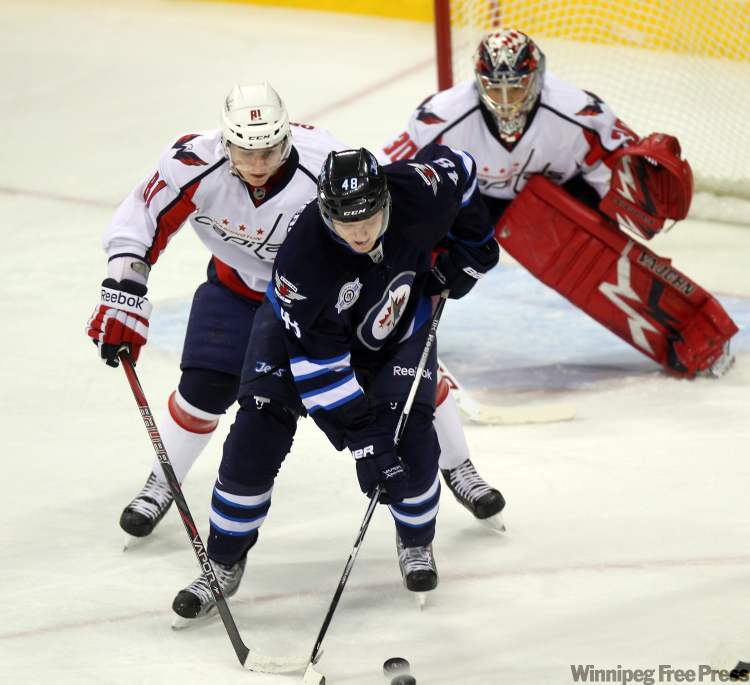 Phil Hossack / Winnipeg Free Press The Winnipeg Jets' Carl Klingberg (48) and Washington Capitals' Dmitry Orlov chase the puck in front of Washington netminder Michael Neuvirth during the first period Thursday.