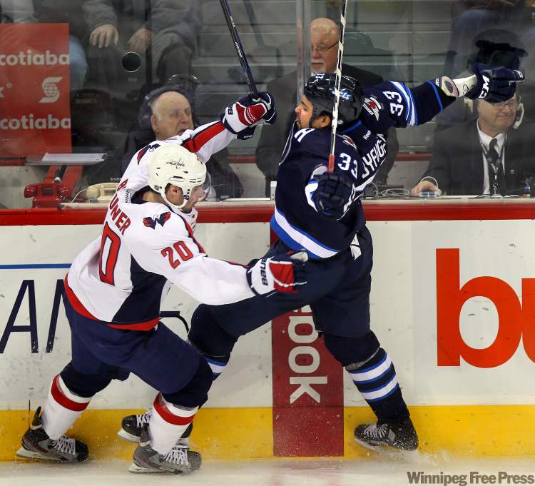 Phil Hossack / Winnipeg Free Press Winnipeg Jets defenceman Dustin Byfuglien collides with Washington Cpitals winger Troy Brouwer in second-period action Thursday.