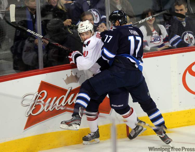 Phil Hossack / Winnipeg Free Press The Winnipeg Jets' Eric Fehr (17) takes Washington Capitals' Dmitry Orlov out of the play in the second period Thursday.