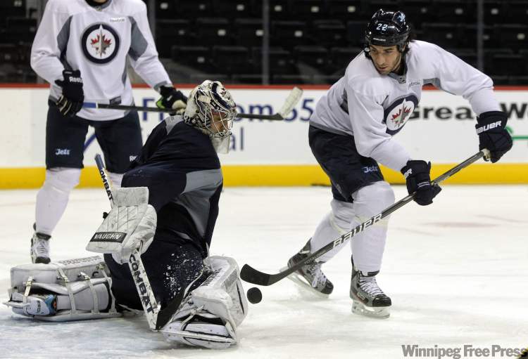 Mike Deal / Winnipeg Free Press Winnipeg Jets' Chris Thorburn (22) tries to flip the puck past goaltender Ondrej Pavelec (31) during pre-game practice at MTS Centre.