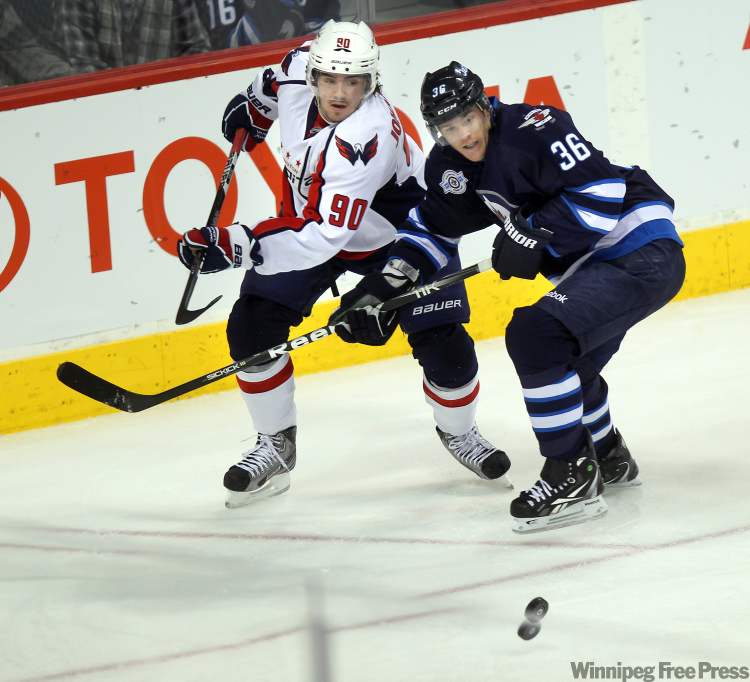 Phil Hossack / Winnipeg Free Press The Winnipeg Jets' Mark Flood (36) and Washington Capitals' Marcus Johansson fight for possession in the Jets' end of the rink during first-period action at the MTS Centre Thursday.