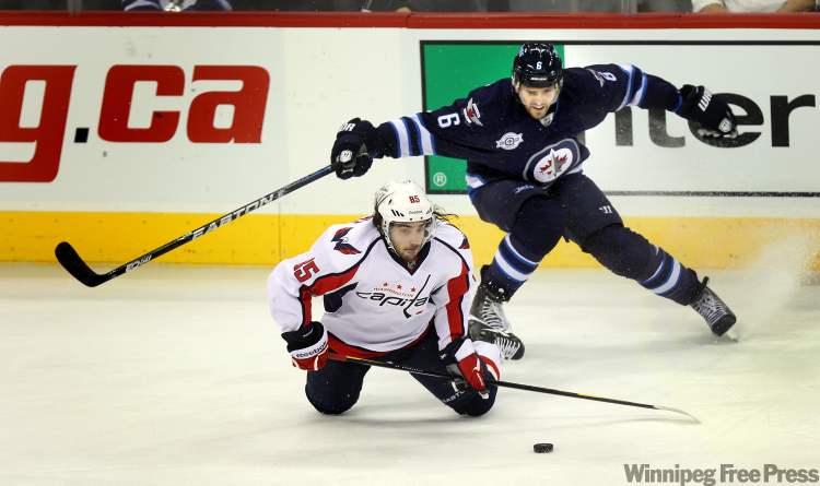 Phil Hossack / Winnipeg Free Press Winnipeg Jets' Ron Hainsey swoops over Washington Capitals' Mathieu Perreault deep in the Jets' zone Thursday at the MTS Centre.
