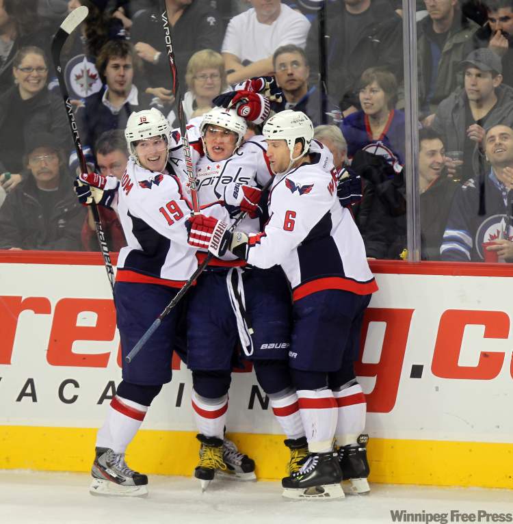 Washington Capitals' Alex Ovechkin celebrates his game-winning goal with teammates Nicklas Backstrom (left) and Dennis Wideman Thursday night at the MTS Centre.