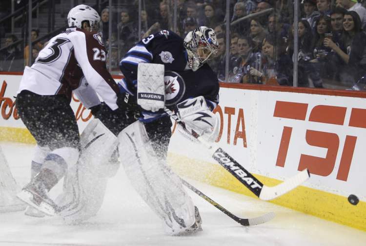 Trevor Hagan / The Canadian Press Colorado Avalanche's Milan Hejduk (23) bumps into Winnipeg Jets' goaltender Ondrej Pavelec (31) as he clears the puck during the first period.