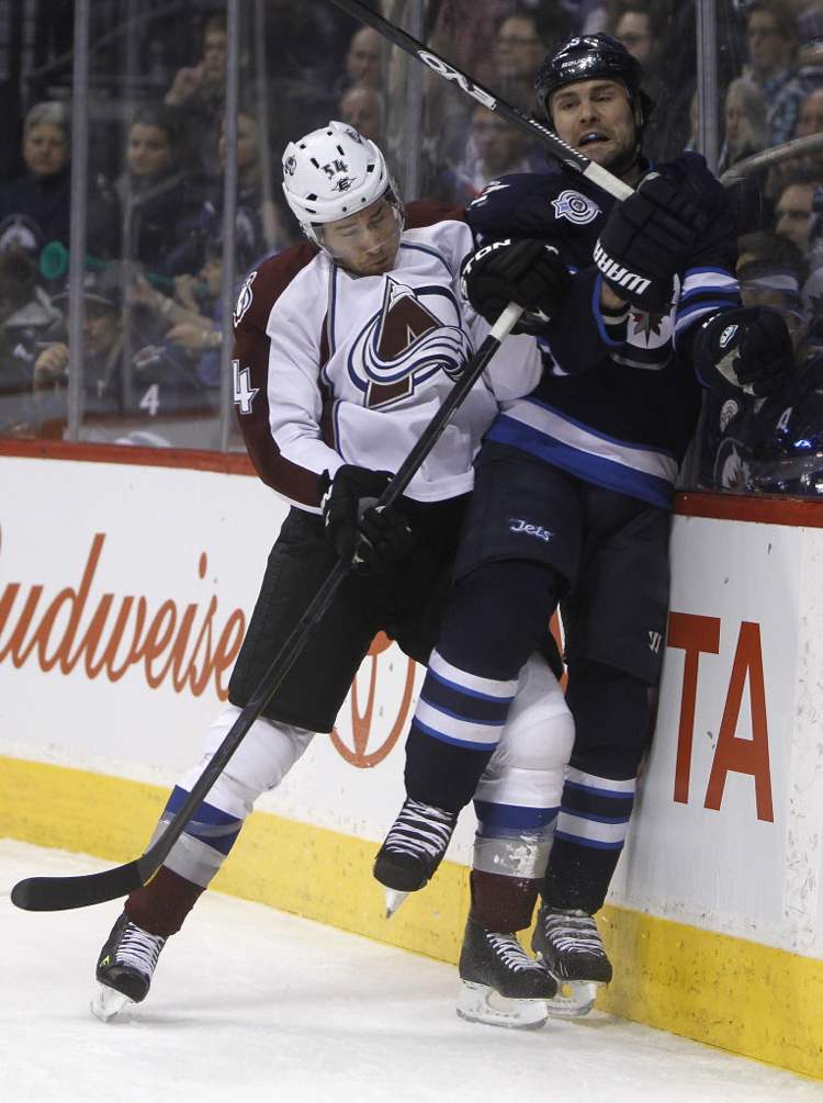 Trevor Hagan / The Canadian Press Colorado Avalanche's Matt Duchene (9) puts a hard check into Winnipeg Jets' Andrew Ladd (16).