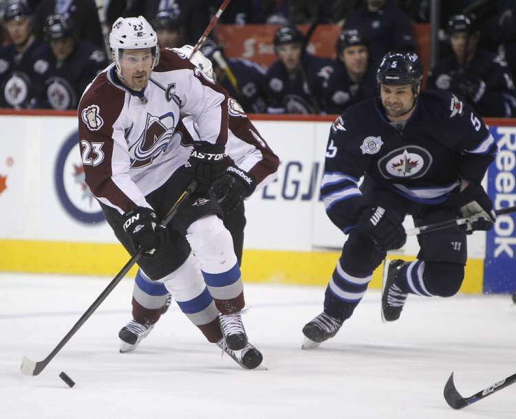 Trevor Hagan / The Canadian Press Colorado Avalanche's Milan Hejduk (23) carries the puck into the Jets zone with Winnipeg Jets' Mark Stuart (5) trailing behind.