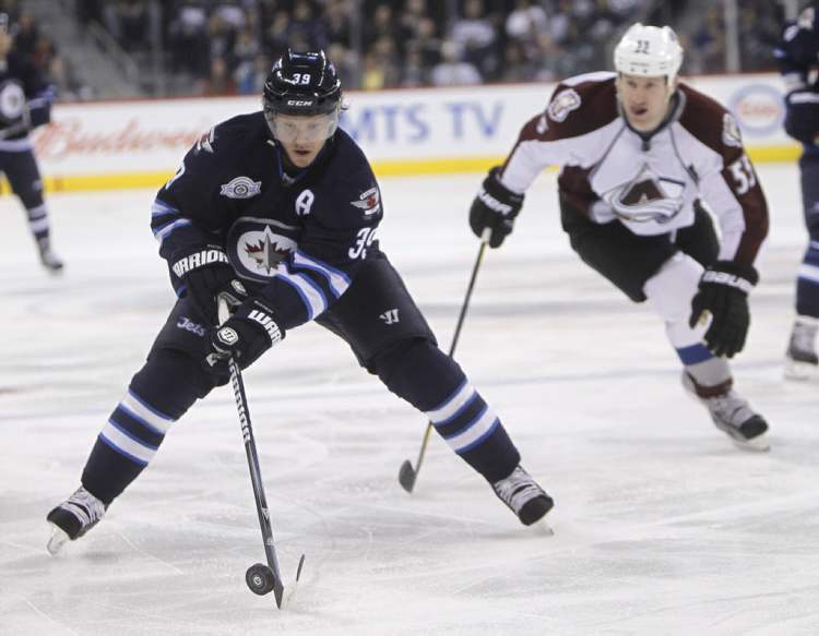 Trevor Hagan / The Canadian Press Winnipeg Jets' Tobias Enstrom (39) carries the puck in the Jets zone in front of Colorado Avalanche's Cody McLeod (55) during the first period.