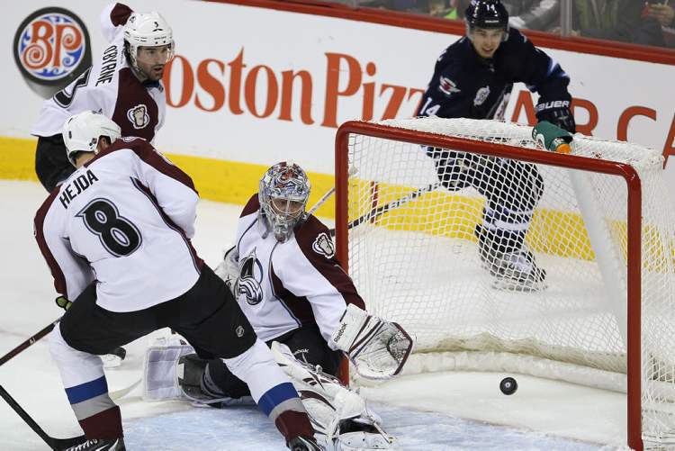 Trevor Hagan / The Canadian Press Colorado Avalanche's Gabriel Landeskog (92) puts the puck past Winnipeg Jets' goaltender Ondrej Pavelec (31).