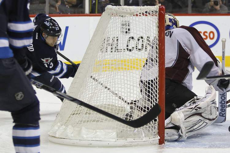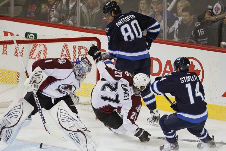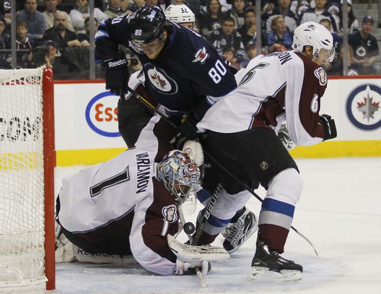John Woods / The Winnipeg Free Press Winnipeg Jets' Nik Antropov (80) is pushed over Colorado Avalanche's goaltender Semyon Varlamov (1) during the second period