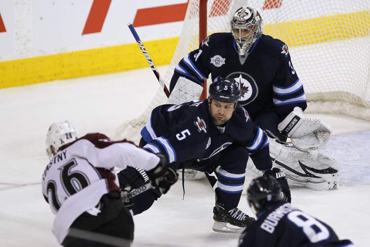 John Woods / Winnipeg Free Press Winnipeg Jets' Mark Stuart (5) gets down to block the shot from Colorado Avalanche's Paul Stastny (26) during first period NHL action in Winnipeg on Sunday.