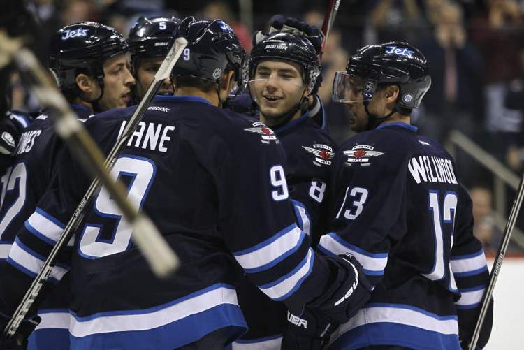John Woods / The Winnipeg Free Press Winnipeg Jets' Alexander Burmistrov (8), Randy Jones (12), Mark Stuart (5), Evander Kane (9) and Kyle Wellwood (13) celebrate a goal against the Colorado Avalanche during the second period.