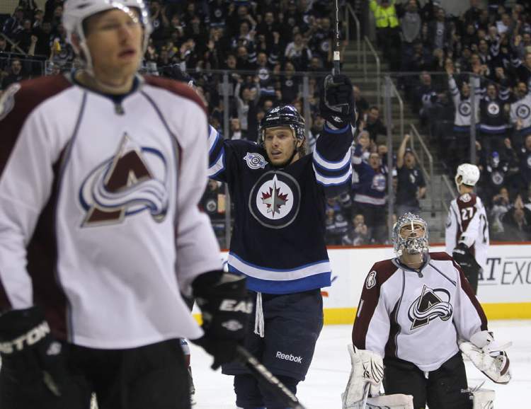 Trevor Hagan / The Canadian Press Winnipeg Jets' Kyle Wellwood (13) celebrates after scoring against the Colorado Avalanche.