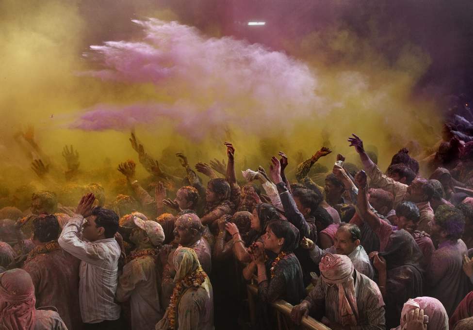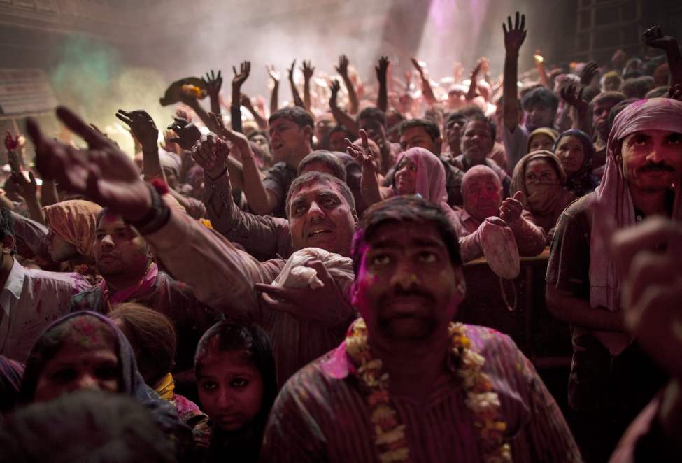 Hindu devotees pray and face a deity as colored powder is thrown on them while celebrating "Holi," the festival of color, crowd at the Banke Bihari temple in Vrindavan, about 140 kilometers (87 miles) from New Delhi, India, Wednesday, March 7, 2012. Vrindavan is a famous place for Holi celebrations, where according to legend, the Hindu god Krishna played Holi with his consort Radha. (AP Photo/Kevin Frayer)CP